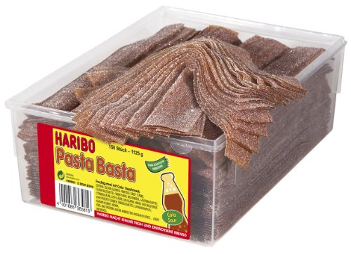 Haribo Pasta Basta Cola Sour ist die ideale Nascherei für alle Cola-Fans, die es gern extrasauer mögen. Die braunen Fruchtgummi-Streifen „versauern“ Ihnen den Geschmack von prickelnder Cola, sodass sie bestimmt Auswirkungen auf Ihre Gesichtszüge haben. Die ca. 18,5cm langen, gezuckerten Bänder sind weich in der Konsistenz und zergehen geradezu auf der Zunge, wenn Sie sie lutschen. Die wiederverschließbare Vorratsbox verspricht dabei einen extralangen und frischen Genuss der sauren Nascherei.