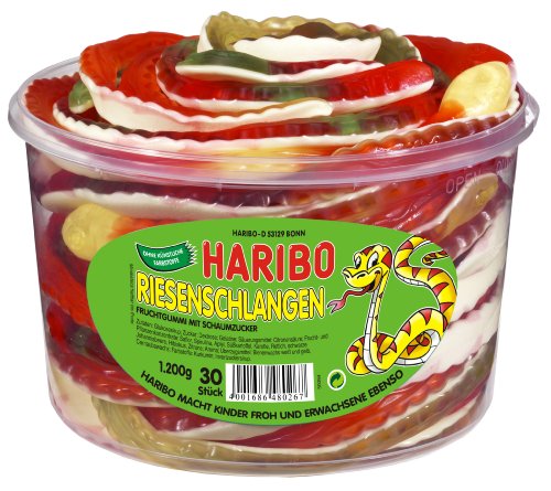 Einen richtig langen Genuss erleben Sie mit den Haribo Anaconda Riesenschlangen. Mit 35 cm Länge und 45 g Gewicht sind die Haribo Riesenschlangen wirklich XXL. Dieser Stückartikel ist eine Kombination aus Fruchtgummi und Schaumzucker und in den Geschmacksrichtungen Saftorange/Erdbeere, Himbeere/Erdbeere und Himbeere/Zitrone mit dem Geschmack von Zitrone im Schaumzucker ein wahrer Genuss.