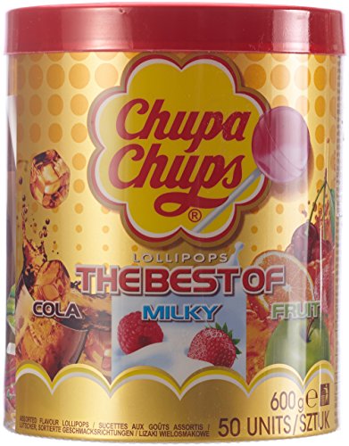 Die Chupa Chups Best Of Dose enthält eine Auswahl an Chupa Chups Frucht Lutschern, Chupa Chups Cola Lutschern, Chupa Chups Joghurt Lutschern und Chupa Chups Sahne Creamy Lutschern.