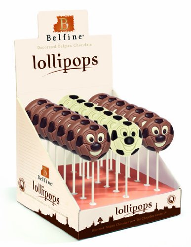 Sie erhalten vier Vollmilch- und zwei weiße Schokoladenlollies in Klarsichthülle mit Klipp verpackt.