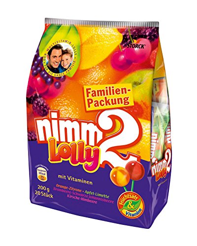 Nimm 2 – Vitamine und Naschen, 20 einzeln verpackte Lollies von Storck, Familien-Packung mit Fruchtsaft und Vitaminen, Frucht-Stielbonbons für die ganze Familie.Nimm 2 – Vitamine und Naschen